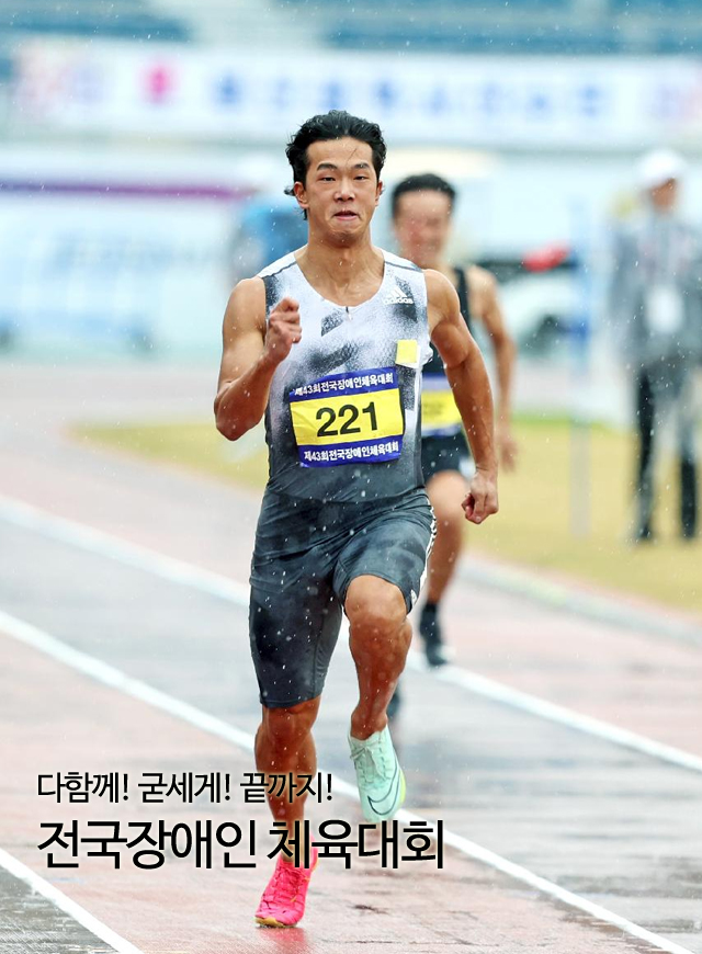 장애를 넘어 희망찬 미래를 향해 힘차게 도약하는 선수들의 따뜻한 정으로 화합 과 희망을 만들어 갑니다. 전국장애인체육대회는 스포츠활동을 통한 장애인 선수들의 경기력 향상과 신인 우수선수 발굴 및 사회적응 능력을 배양, 전국 순 회 개최를 통한 장애인과 비장애인이 함께하는 사회분위기를 조성하고 장애인 에 대한 국민의 이해 증진을 목적으로 합니다.